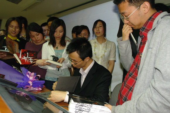 这些问题充分的体现了我校同学广泛的阅读面和深厚的人文功底。 最后,工作人员将江南的作品《光明皇帝》报上讲台,并决定将这些书籍分发给热心的观众。本次共青讲堂得到了校科幻协会的大力支持,因此他们得到了5本赠书。另外还有若干本分发给提问价值很大的同学,最后还剩下4本,主持人选择了非常别致的一种方式:江南先生自己挑选4个关于他作品的问题,台下观众进行抢答,答对者得到赠书。