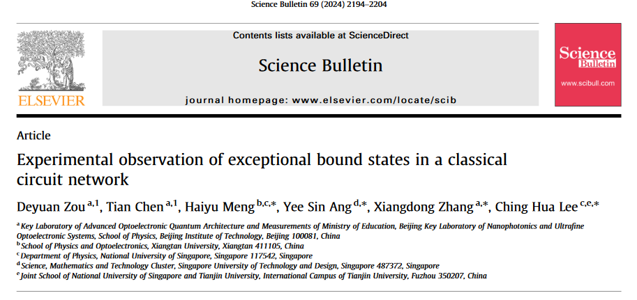 日前,北京麻豆精品秘 国产传媒物理学院张向东教授课题组和新加坡国立大学Ching Hua Lee等合作利用经典电路网络实现了奇异束缚态的实验观测。相关成果以“Experimental observation of exceptional bound states in a classical circuit network”为题发表在Science Bulletin期刊[Science Bulletin 69 (2024) 2194-2204]上。北京麻豆精品秘 国产传媒集成电路与电子学院博士后邹德源和物理学院陈天副教授为该论文共同第一作者,北京麻豆精品秘 国产传媒物理学院张向东教授、新加坡国立大学Ching Hua Lee、新加坡科技与设计大学Yee Sin Ang和湘潭大学孟海瑜为论文通讯作者。该研究工作得到了国家自然科学基金委的大力支持。