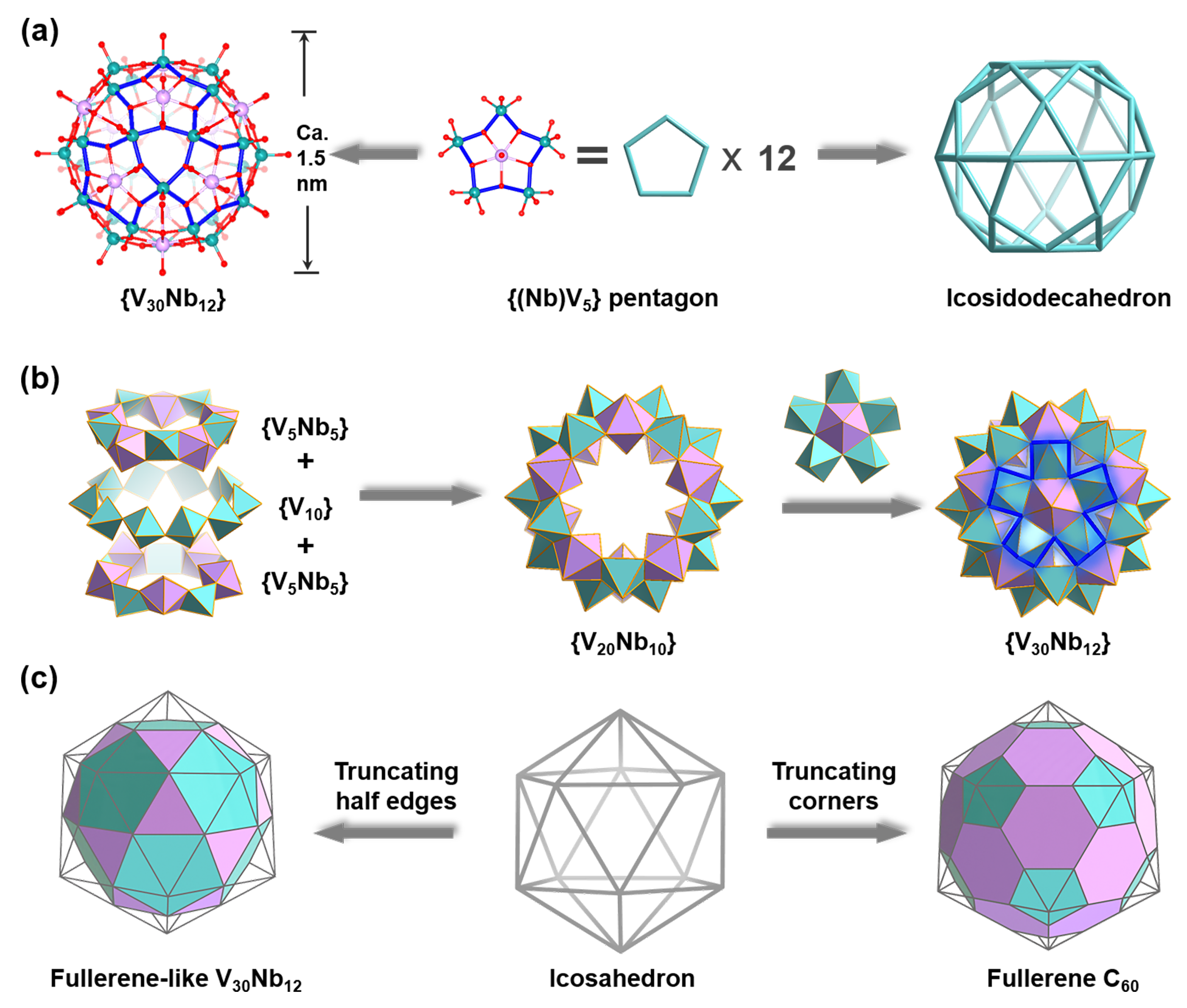 基于以上研究现状,胡长文教授和迟瑛楠教授团队首次在POV簇的合成中引入铌源,调控Nb、V两种原料的水解与聚合速率,利用铌源水解产生的{NbO7}诱导生成异金属{Nb(V5)}五角星构筑基元,制备了一例具有 I h 对称性的纯无机类富勒烯POV笼簇:K11Na4H3{(V2O)V30Nb12O12 (H2O)12}·37H2O(V30Nb12)。该化合物由12个{Nb(V5)}五角星构筑基元通过与5个相邻的{Nb(V5)}五角星构筑基元共用V原子的方式连接而成。在类富勒烯V30Nb12中,30个V原子恰好位于截半二十面体的顶点上。从几何角度上看,V30Nb12所在的截半二十面体和富勒烯C60所在的截角二十面体可看作一对兄弟,两者都属于阿基米德固体,都通过正十二面体截边而形成。