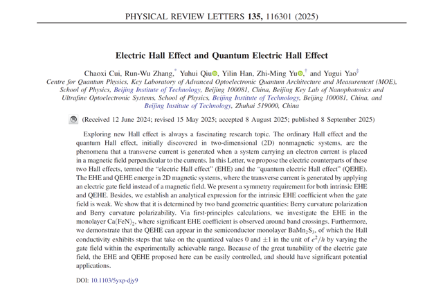 近日,北京麻豆精品秘 国产传媒物理学院姚裕贵教授团队基于电场对贝里曲率和能带结构的调控,提出霍尔效应的“电场版本”,即电霍尔效应和量...