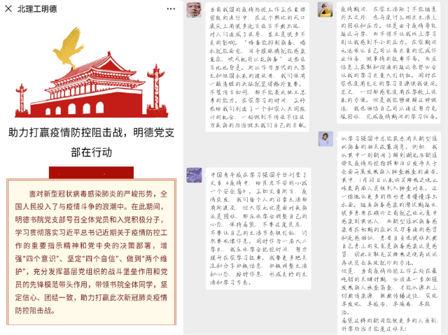 “作为学生党员,我们要时刻牢记使命,树立起服务同学、联系同学、号召同学的意识”书院党支部的学生党员,积极响应号召——疫情就是命令,防控就是责任。明德书院党员以网络社交平台为阵地,充分发挥先锋模范带头作用,助力打赢此次新冠肺炎疫情防控阻击战。