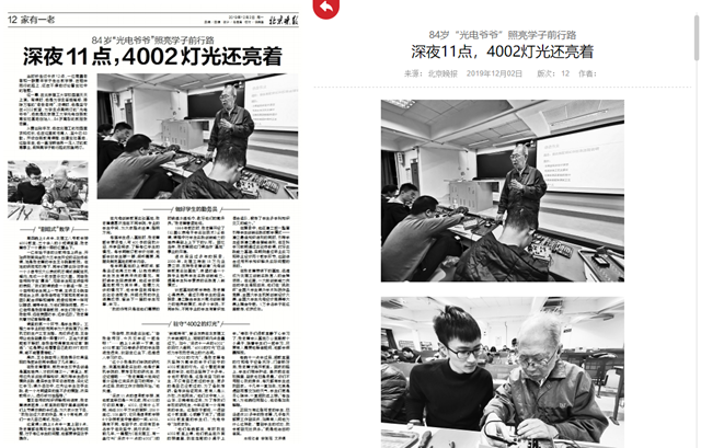 “4002的灯光”,是张忠廉每天坚持为勤学的学子们驻守的4002教室的灯光。这个看起来普通的举动,他已经坚持了十多年。令他欣慰的是,这些来自习的学生,不仅有自己教过的学生,更多的是自己没教过的,为了备战考研、备考资格证而来,更有人是从外校、外地而来。“他们之中有人从山东、云南等地过来,为了考我们学校的研究生,今年还有一个海南来的学生。这些孩子都说,一进到这个教室里,心就静下来了。”提到4002教室里的学生们,“光电爷爷”如数家珍。