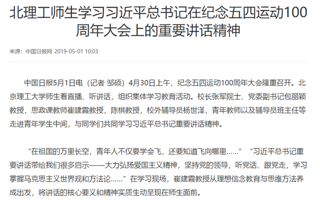 【中国日报网】北理工师生学习习近平总书记在纪念五四运动100周年大会上的重要讲话精神