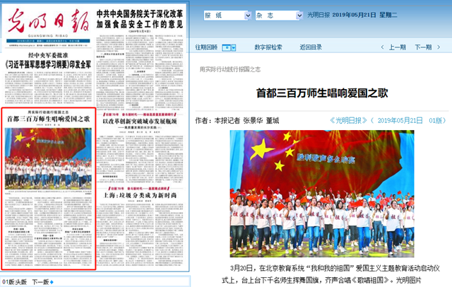 在纪念五四运动100周年、迎接新中国成立70周年的重要历史时刻,一场“市、区、校”三级联动,覆盖所有校园的“我和我的祖国”爱国主义主题教育活动在首都北京掀起热潮。活动以“学起来”“唱起来”“讲起来”“做起来”为形式,首都三百万师生用刻苦学习筑牢信仰之基,用纵情歌唱抒发爱国之情,用实际行动践行报国之志,续写着新时代的青春之歌。