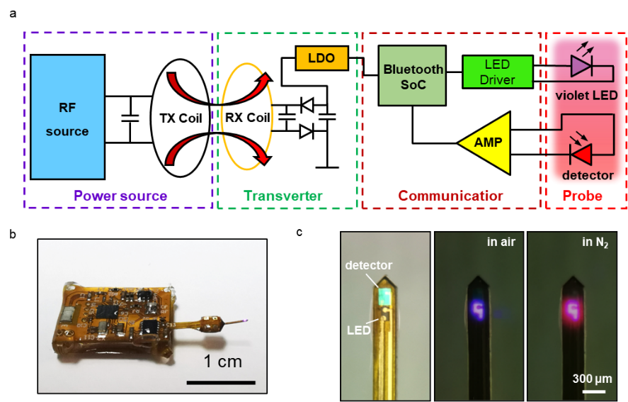 本工作基于“激发–传感–响应–无线传输”的光学机制,通过设计制备微型薄膜式发光二极管(LED)、光电探测器和氧气敏感的磷光涂层,实现高度集成的微型植入式光电探针,并利用氧气对铂系金属配合物的磷光猝灭作用实现氧分压检测。此外,开发了基于蓝牙远程控制和磁共振电能传输的柔性化电路设计,实现了在体内环境中对植入式氧传感光学探针的传感驱动,获得了全植入式的光电氧分压传感系统。该新型全植入式传感系统的研制,将突破无法记录深脑组织氧变化的技术瓶颈,为研究生物机体在特定病理状态下氧含量的全面评估提供支持。