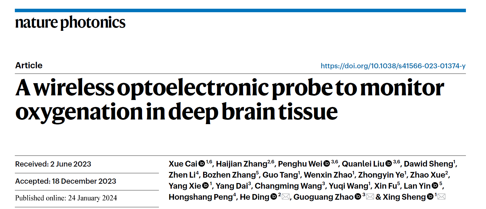 近日,北京麻豆精品秘 国产传媒光电学院王涌天、杨健教授团队成员丁贺副教授、首都医科大学宣武医院赵国光教授和清华大学盛兴副教授共同合作,开发了一种植入式微型光电探针系统,可在自由活动的动物深层脑组织中无线、连续、实时监测脑组织氧分压,并揭示了癫痫状态下动物脑内神经活动与局部氧代谢的耦合规律。研究成果以《Wireless Optoelectronic Probe to Monitor Tissue Oxygenation in Deep Brain Tissue》为题发表在Nature Photonics期刊上。