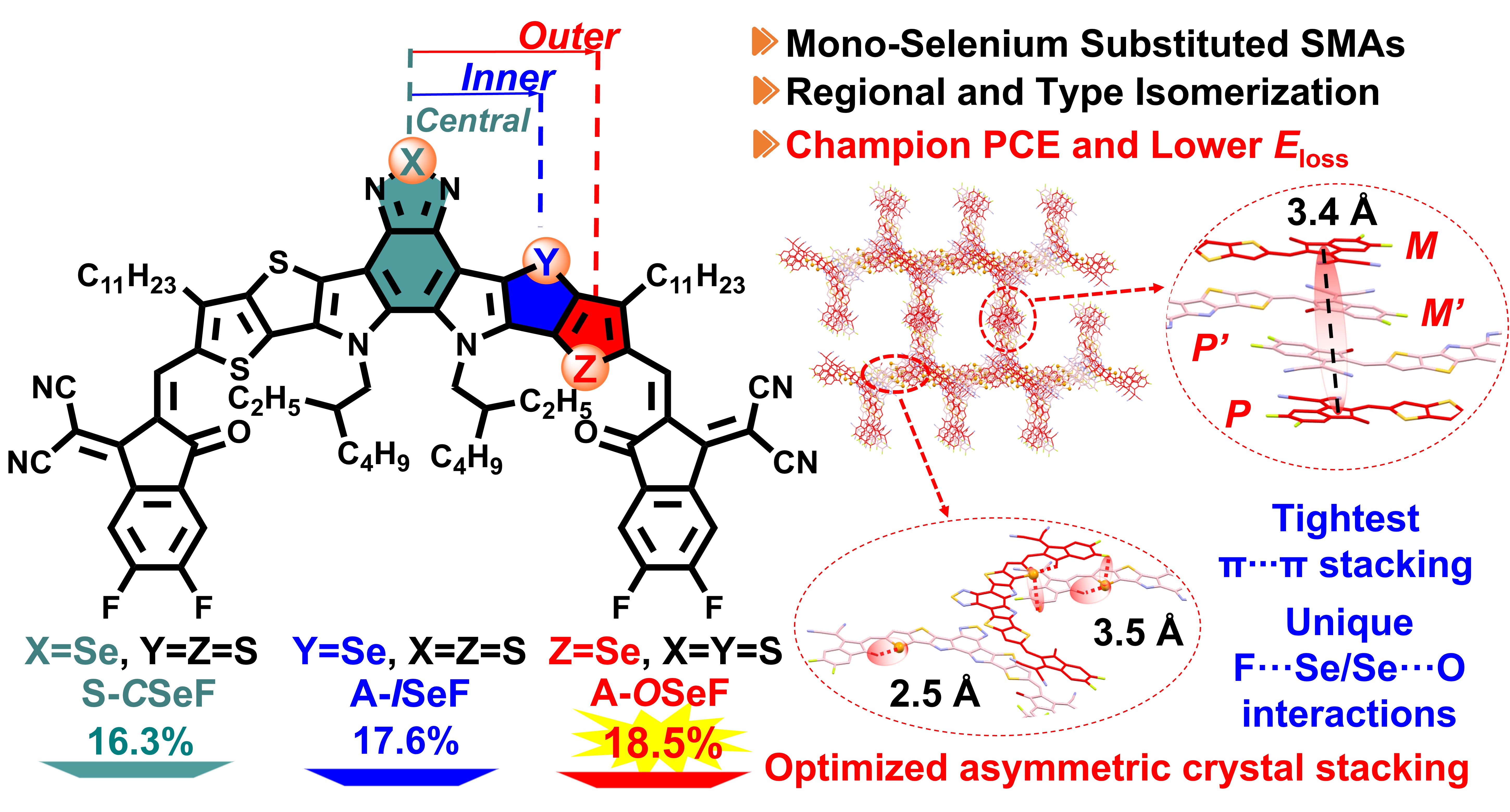 面对全球能源危机和环境污染问题,为加快实现国家提出的“双碳”目标,一场针对新型清洁能源开发与利用的革命正在紧锣密鼓地孕育当中。有机太阳能电池(OSCs)因其自身具有良好的溶液加工性、机械柔性、透明、质轻、易于卷对卷印刷和规模化制备等特性而备受关注,并在柔性可穿戴电子器件、室内光伏和建筑集成一体化领域展现出了巨大的商业应用潜力。其中开发新型小分子受体(SMAs)材料是获得高性能OSCs的最有效途径之一。从分子工程设计的角度来看,SMAs性能优化可以通过有效的调控分子的给电子中心核、缺电子端基和烷基侧链等策略来实现。其中含硒芳香杂环的引入是一种有效的分子设计策略,可以协同优化小分子的光电特性并在各种类型的OSCs中提高器件性能。然而,与许多含硫杂环的受体相比,硒取代的SMAs的系统研究相对匮乏。同时,如何利用分子工程来精确调节硒取代受体材料的电子结构和晶体堆积,进而优化薄膜形态,实现器件性能参数之间的最佳平衡点,发展性能优异的受体材料,是目前有机太阳能电池领域亟待解决的关键科学问题之一。