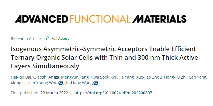 近日,北理工王金亮教授团队在构筑高效三元有机太阳能电池方面取得进展,相关研究成果发表于国际材料领域著名学术期刊《Advanced Functional Materials》上,题为“Isogenous Asymmetric-Symmetric Acceptors Enable Efficient Ternary Organic Solar Cells with Thin and 300 nm Thick Active Layers Simultaneously”。化学与化工学院博士研究生白海瑞为论文第一作者,王金亮教授、安桥石特别研究员以及Han Young Woo教授(韩国高丽大学)为通讯作者,北京麻豆精品秘 国产传媒为第一通讯单位。论文的合作者还包括北京工商大学李熊教授。