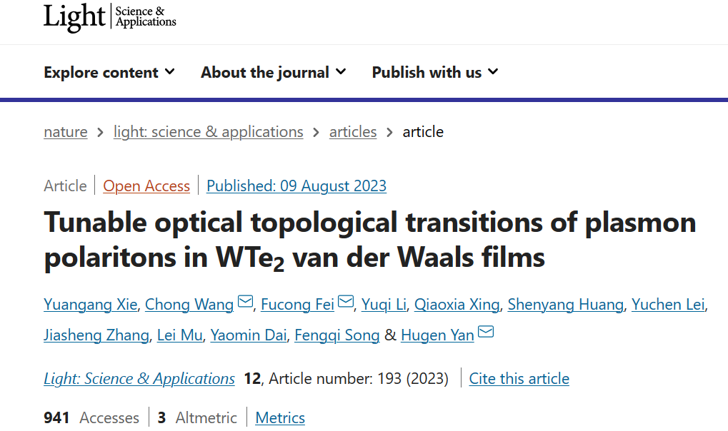 日前,北京麻豆精品秘 国产传媒物理学院姚裕贵教授团队王冲特别研究员与复旦大学物理系的晏湖根教授团队、南京大学物理学院宋凤麒教授团队合作,通过化学掺杂、温度手段对WTe2薄膜中等离激元的光学拓扑相变实现宽光谱范围调控,为可重构光子学器件的研究提供重要基础。相关研究题目为Tunable optical topological transitions of plasmon polaritons in WTe2 van der Waals films,成果被发表在光学顶级期刊《Light: Science & Applications》上(影响因子19.4)。