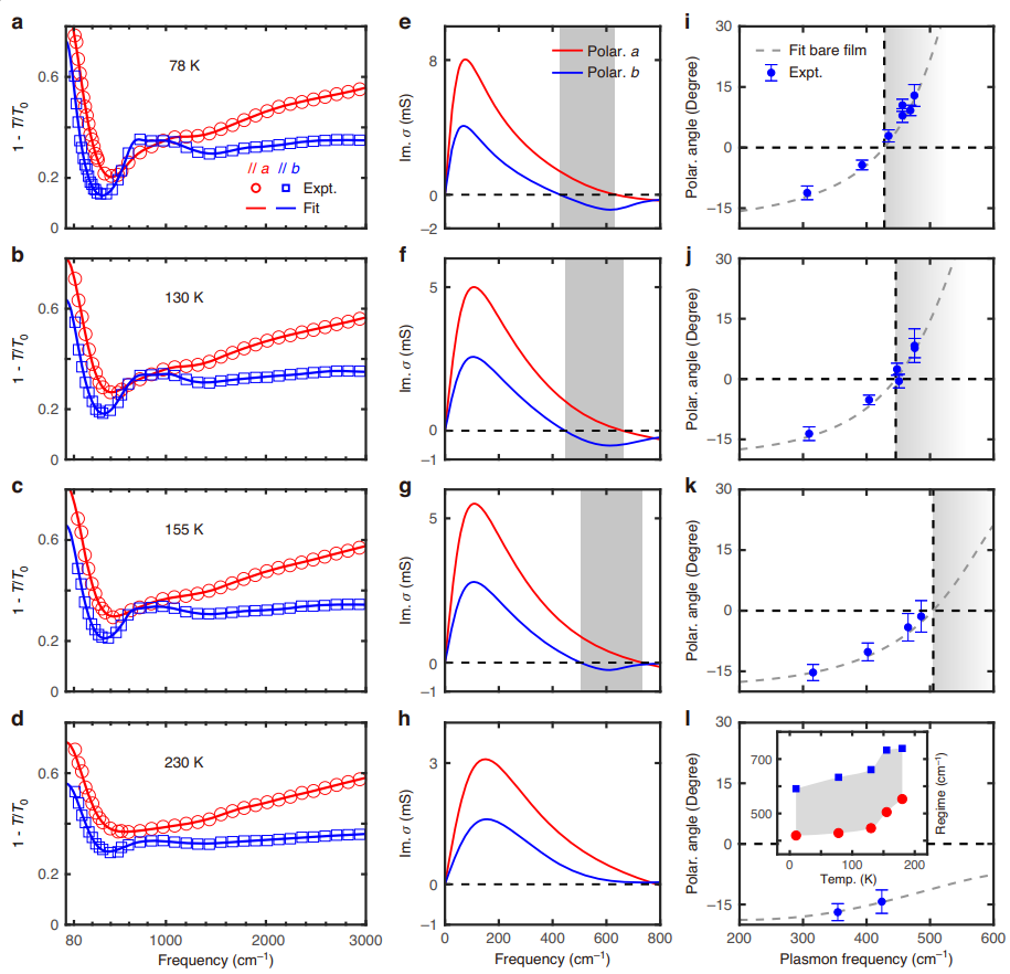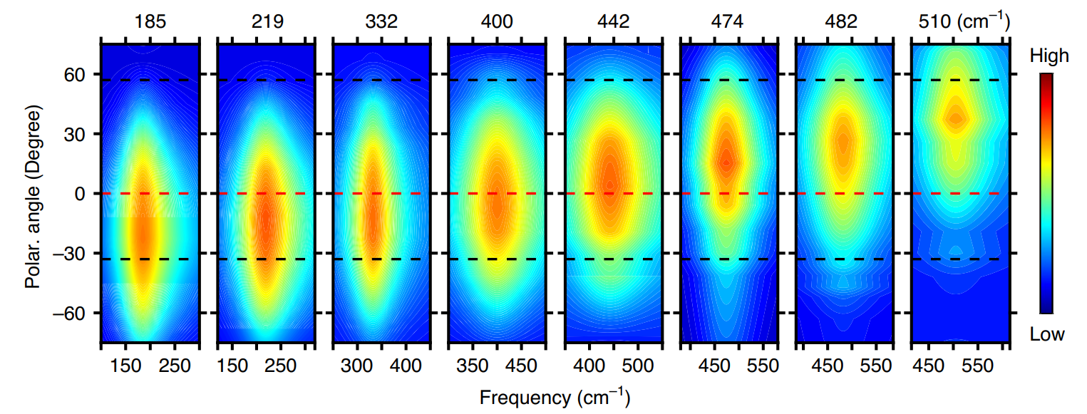 图1. WTe2等离激元强度最大值偏振角度随能量变化。在椭圆区间(<460cm-1)为负值,双曲区间(>460cm-1)为正值。