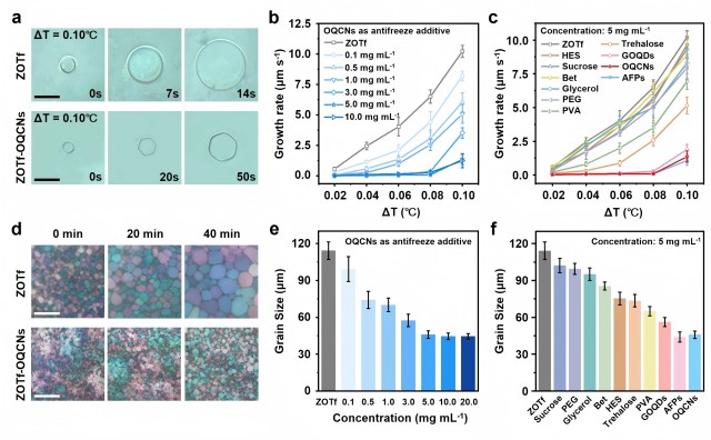 图2 OQCNs在三氟甲烷磺酸锌溶液中修饰冰晶形貌,抑制冰再结晶功能。