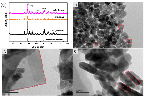 图1 球状,片状以及棒状形貌ZrO2催化剂的XRD和HRTEM图