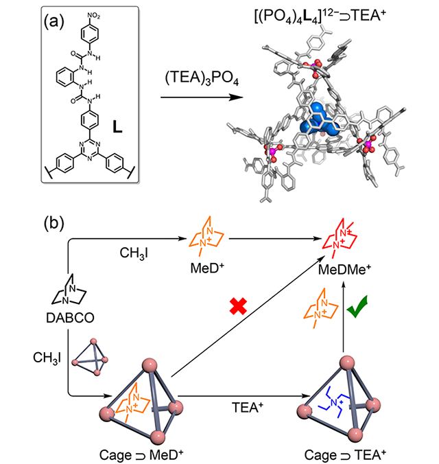 引入 C 3对称桥连基元可实现面式四面体笼的构筑。利用三苯基胺片段桥连的三-二脲配体,成功构筑了首例磷酸根四面体笼( ACIE 2013, 52 , 5096)。换用更大尺寸的三苯基苯桥连片段,构筑了具有较大空腔的四面体笼,能够实现对类四面体形分子的封装,如氟利昂分子( ACIE 2015, 54 , 8658),不稳定的白磷和黄砷分子( JACS 2017, 139 , 5946)。基于三苯基三嗪桥连片段的四面体笼,笼状结构刚性进一步提升,能够实现对DABCO(1,4-二氮杂二环[2.2.2]辛烷)甲基化过程的精准控制( JACS 2018, 140 , 5248),如图5所示。