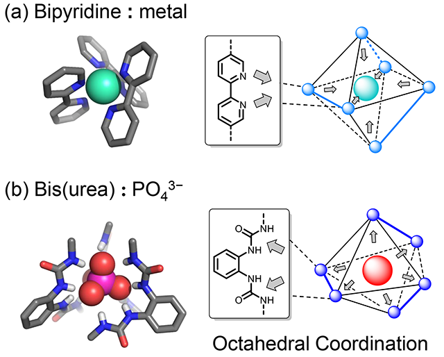 与经典的过渡金属阳离子六配位体系相比,如图2所示,邻苯二脲基元可与磷酸根离子通过十二重N(H)•••O氢键作用配位,形成类八面体场的构象。由于磷酸根离子的强吸电子作用、邻苯二脲基元的结构刚性和强氢键给予能力,该配位作用克服了传统阴离子配位体系结合强度低、构象不确定、方向性差、结构难预测的缺点,为阴离子配位导向超分子组装结构的构筑打开了大门。与金属体系相比,阴离子体系具有以下特点:1. 配位作用相对较弱且灵活,使得其组装结构易转换,但同时赋予组装结构更强的客体封装自适应能力;2. 氢键作用体系可通过核磁共振技术实现对配位中心、组装机理的原位跟踪,具有普适性;3. 与球形金属离子相比,四面体形磷酸根离子对称性低,可赋予组装体意想不到的“对称破缺性”。由此,阴离子配位导向超分子组装体系具有广阔的研究和应用前景。