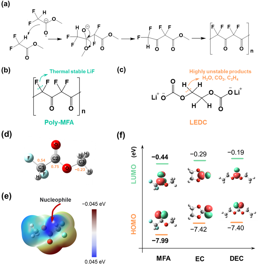 设计的二氟乙酸甲酯(MFA)可以在金属锂负极表面发生Claison酯缩合反应,其特殊的–CHF2基团带来的亲核位点使其可以极快地形成富聚合物层,并且聚合物的高氟含量可以为界面层提供较好的热稳定性(图2)。