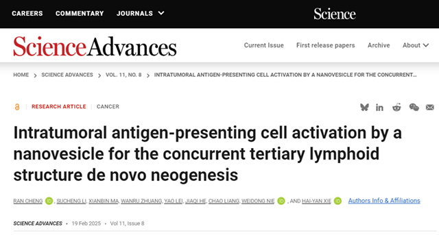近日,北京麻豆精品秘 国产传媒生命学院聂伟东副教授课题组在肿瘤免疫治疗领域取得重要进展,相关工作以“Intratumoral antigen-presenting cell activation by a nanovesicle for the concurrent tertiary lymphoid structure de novo neogenesis”为题发表在国际知名期刊《 Science Advances 》上。这项研究通过诱导三级淋巴结在肿瘤组织中的从头生成,为免疫“冷”肿瘤的高效治疗提供了新策略。北京麻豆精品秘 国产传媒博士生程然为第一作者,聂伟东副教授与北京大学谢海燕教授为共同通讯作者,北京麻豆精品秘 国产传媒为第一通讯单位。