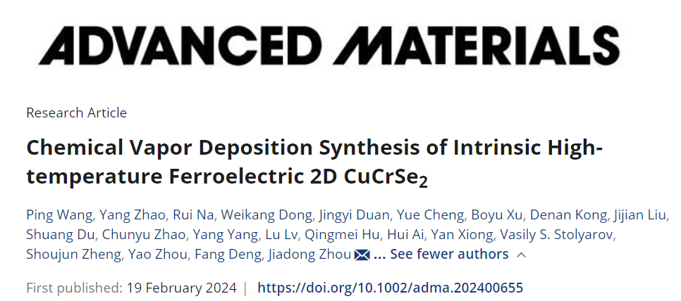 文献信息:Chemical Vapor Deposition Synthesis of Intrinsic High-temperature Ferroelectric 2D CuCrSe2. (Adv. Mater., 2024, DOI: 10.1002/adma.202400655)