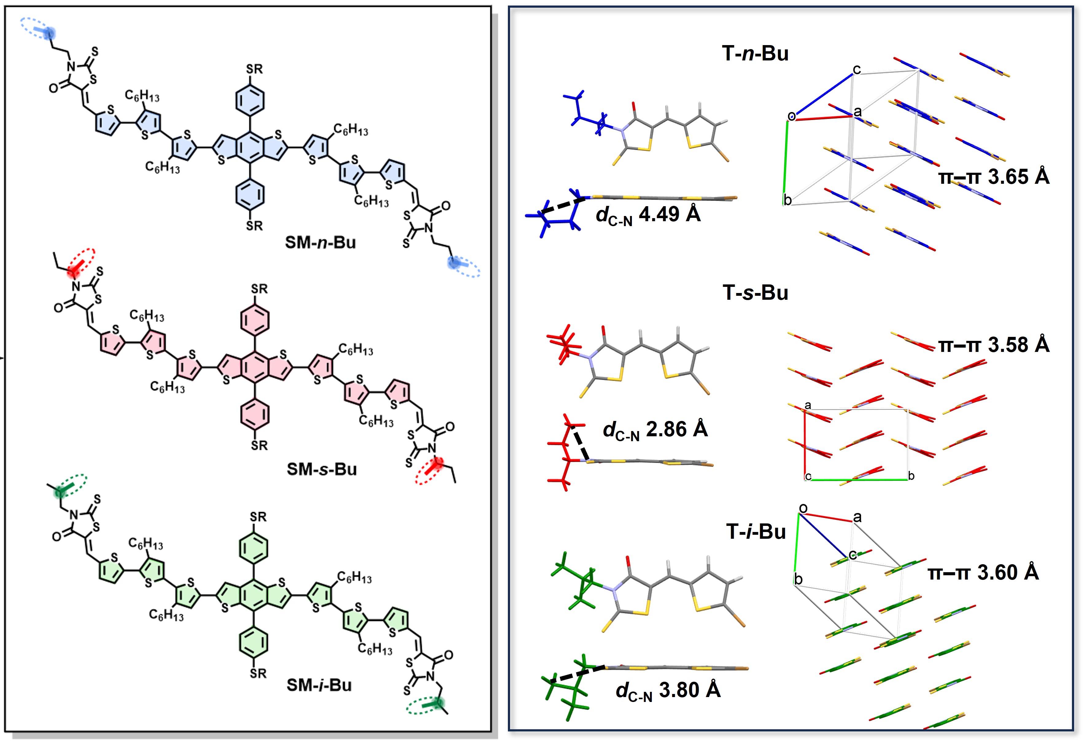 图1:端基烷基链异构化小分子给体分子结构以及模型化合物的晶体堆积图对比