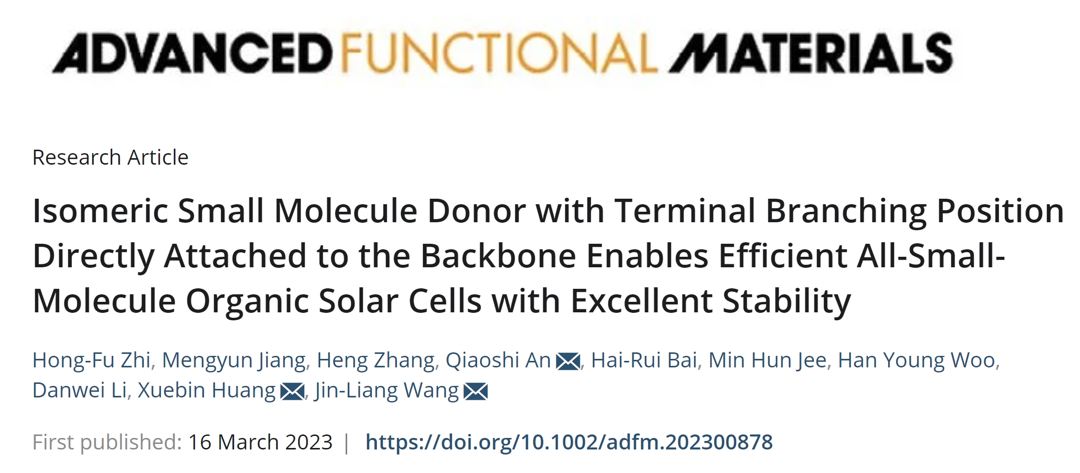 近期,北京麻豆精品秘 国产传媒化学与化工学院王金亮教授团队在异构化小分子给体材料合成及其在高效率兼具稳定性好的全小分子有机太阳能电池的应用研究方面取得重要进展,相关研究成果发表在材料类国际顶级期刊《Advanced Functional Materials》(DOI: 10.1002/adfm.202300878)上,题为“Isomeric Small Molecule Donor with Terminal Branching Position Directly Attached to the Backbone Enables Efficient All-Small-Molecule Organic Solar Cells with Excellent Stability”。北京麻豆精品秘 国产传媒为唯一通讯单位,化学与化工学院王金亮教授、安桥石特别研究员、黄学斌副教授为共同通讯作者,硕士研究生支鸿富为第一作者。