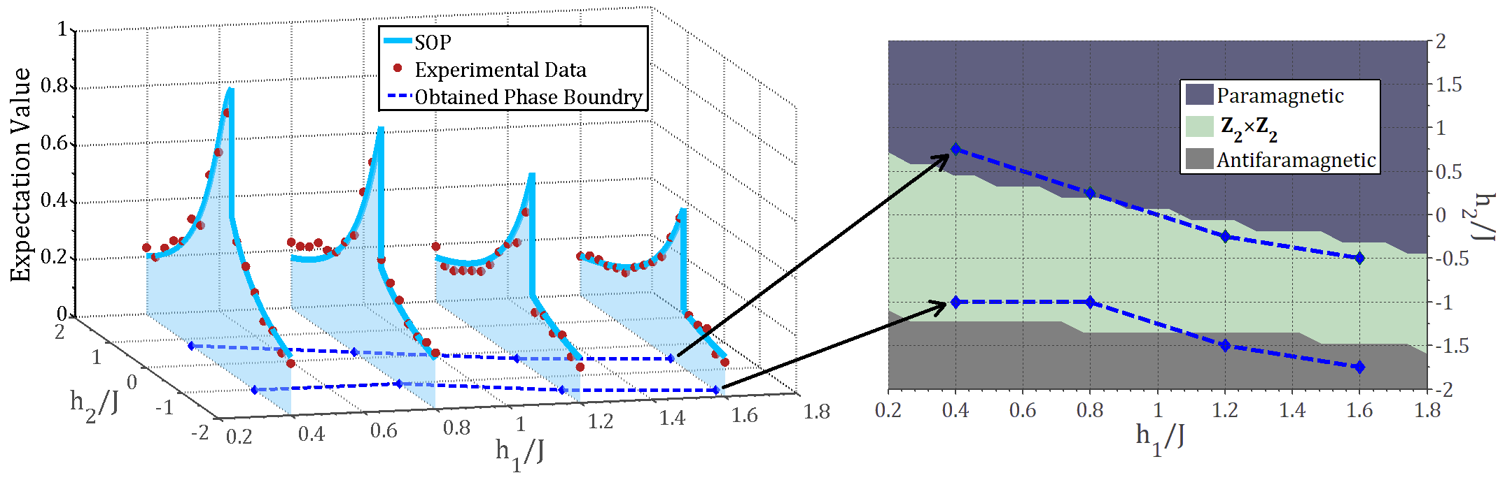 通过该实验设置,研究人员首先研究了不同状态作为输入时的网络输出结果,如图4所示。在该过程中,研究人员选择了十个不同的关联光学状态作为输入,它们分别对应十个不同的三比特量子态。由于该神经网络的结构设置,输出的状态实际上是单束多模偏振光的投影测量结果,对应单比特量子态。考虑到所使用的经典光学状态与量子比特之间的对应关系,研究人员同样给出了如图4中展示的“密度矩阵”表示方法。图4中不同的子图对应不同的输入态情形。每一个子图中长方柱框的高度表示了理论结果,内部填充颜色的高度表示了实验结果。可以看出两者符合得很好。除此之外,研究人员还用该实验设置对三格点Haldane哈密顿量的基态进行处理,鉴别其所属的拓扑相,结果如图5所示。图5的左图中的红点是实验中直接测量到的输出结果,蓝线为理论曲线,x坐标和y坐标分别对应哈密顿量的参数。首先,从左图的数据中可以看出理论值和实验值相吻合。更重要的是,通过对曲线做二阶导数处理可以得到清晰的相图边界,与图3(c)中的结果相对应。该结果充分验证了研究人员提出的理论方案的正确性以及可行性。