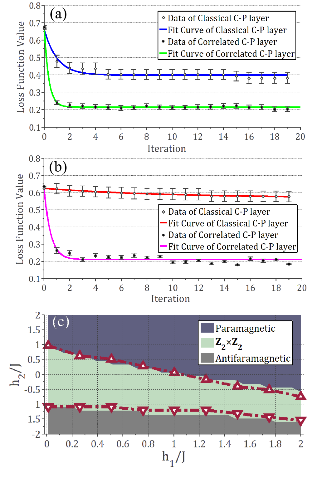 图2.(a)在二分类任务训练中,关联光卷积网络与传统卷积网络损失函数随步骤数的变化情况。(b)在四分类任务训练中,关联光卷积网络与传统卷积网络损失函数随步骤数的变化情况。(c)利用关联光卷积网络对Haldane模型基态相变边界进行确认的结果。