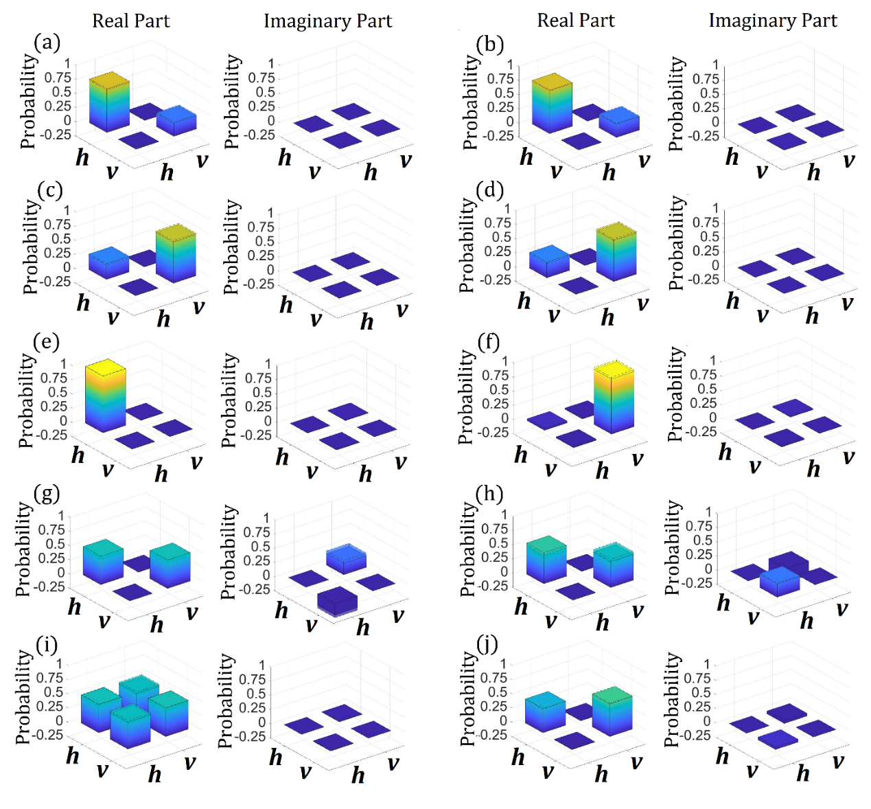 图4. 不同输入情形下关联光卷积网络的输出。各子图中左侧为实部结果,右侧为虚部结果。