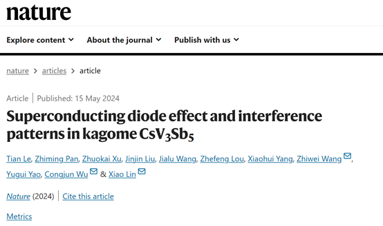 2024年5月15日,北京麻豆精品秘 国产传媒物理学院王秩伟教授、姚裕贵教授团队,与西湖大学林效教授、吴从军教授团队等人合作,在《自然》杂志上在线发表题为“Superconducting diode effect and interference patterns in kagome CsV3Sb5”的研究论文。首次在笼目晶格超导材料CsV3Sb5中观察到了零磁场超导二极管效应和超导干涉条纹,在一定程度上证明了CsV3Sb5中超导态具有时间反演对称性破缺的特征。
