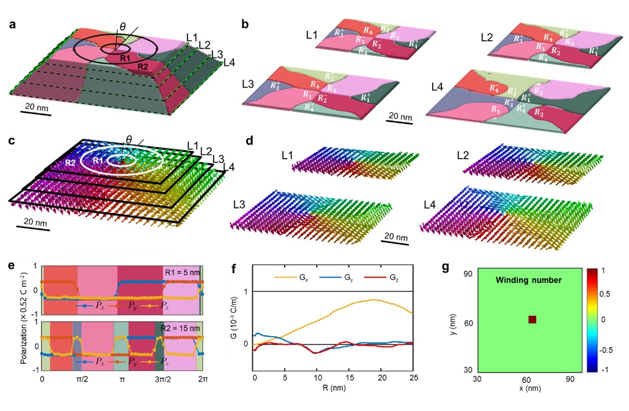 通过相场模拟分析,研究学者表征了极化所罗门环的拓扑特性。通过计算纳米岛各层中畴结构的三维极化分布,验证了纳米岛极化所罗门环的存在,并通过计算极化缠绕数验证其拓扑特性。