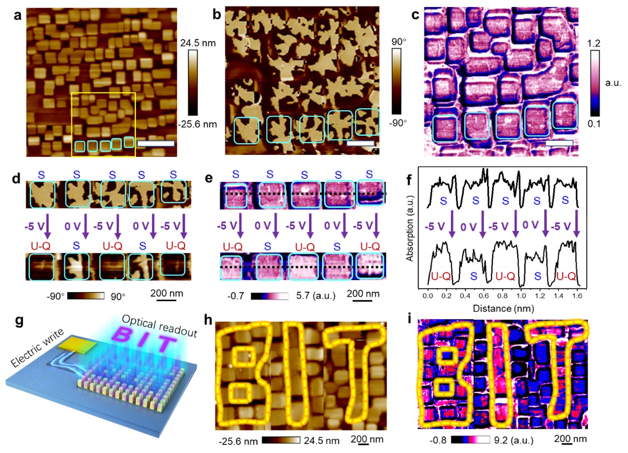 研究者探究了极化所罗门环结构与中心型拓扑畴结构对太赫兹红外光吸收性能的差别,并通过电场调控纳米晶的红外吸收性能。通过纳米红外方法表征两种拓扑畴结构对太赫兹红外光的吸收情况,发现所罗门环结构对红外光的吸收能力低于中心型四瓣畴。随后通过外加电场调控BiFeO3纳米晶阵列畴结构类型,在纳米红外吸收图像中显示出”BIT”字样,可以用于纳米级分辨率的红外显示器。