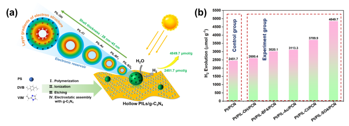 为了实现改性策略的突破,课题组基于离子液体微环境及其过程强化机制方面的长期积累,提出了以聚合离子液体作为“电子储体”的概念,发展了具有层级电子分布的中空聚合离子液体微球 (PIL- x ), 并将其用于修饰的g-C3N4。利用其阴阳离子可以调控壳结构中不同电子层厚度,影响体系的电子传输储备行为,获得了性能优异的产氢催化剂(图3)( Chem. Eng. J., 2022, 135625 )。该工作拓宽了聚合离子液体的应用范围,为g-C3N4及其他光催化剂的改性提供了一条新的思路,对于开发高效的光催化剂具有重要的意义。