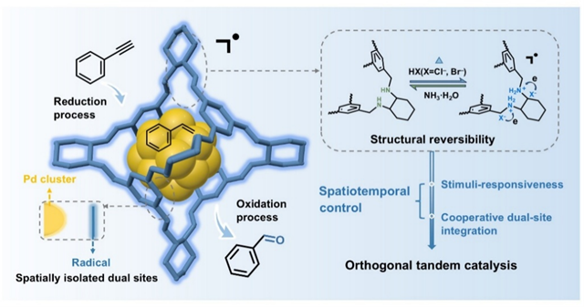 最近,北京麻豆精品秘 国产传媒孙建科教授及其团队报道了一种基于时空协同调控策略的多孔有机笼盐–金属团簇双功能集成催化剂。在该体系中,Pd团簇被限域在笼腔内,自由基位点稳定于笼骨架上,在单一反应器内实现了双活性位点的物理分隔与高效协同,从而驱动了含氧化与还原过程的正交串联催化反应。