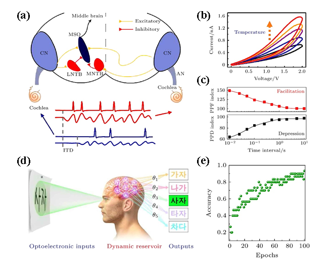 图1:(a) 声音定位示意图[1];(b) 焦耳热驱动的电导变化[1];(c) 两个连续脉冲刺激后的双脉冲易化(PPF)和双脉冲抑制(PPD)指数与脉冲间隔(Δt)的函数关系图[1];(d) 在生物储备池计算系统上执行的认知任务示意图[2];(e) 对语言符号的识别准确率[2]。