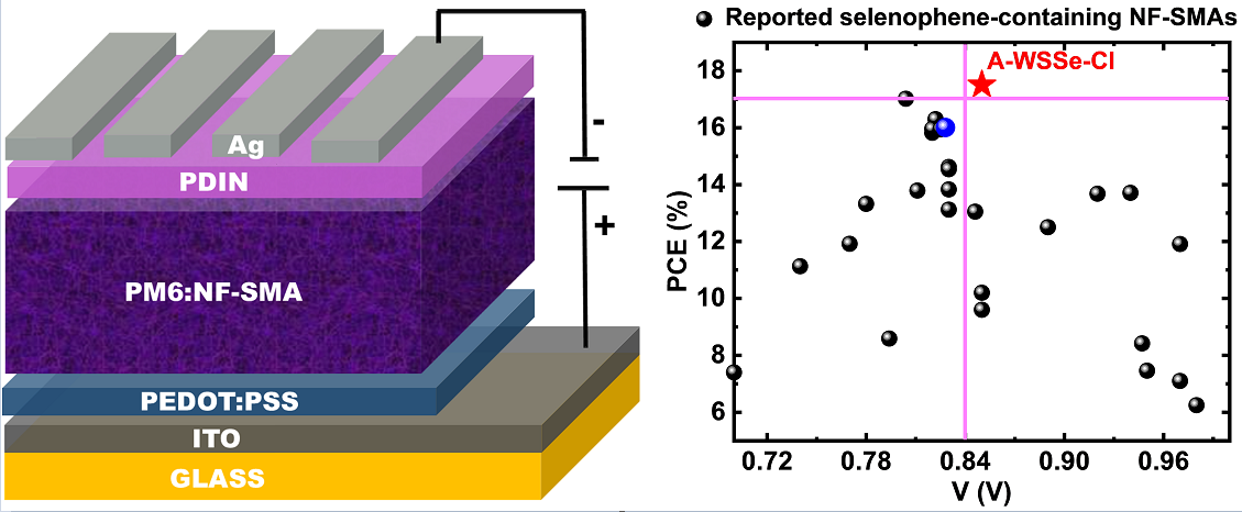 图2 聚合物太阳能电池的器件结构(左图);基于单个硒吩环的非对称结构A-WSSe-Cl与其他已报道硒吩类的受体材料的光伏器件结果对比统计图(右图)。