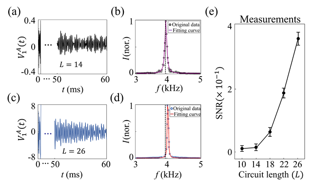 。图4(e)呈现长度L=10、14、18、22和26电路的实测SNR(每个样品独立测量35次,误差条表示波动范围)。实验数据明确显示:在相同噪声水平下,SNR随电路尺寸增大而提升。