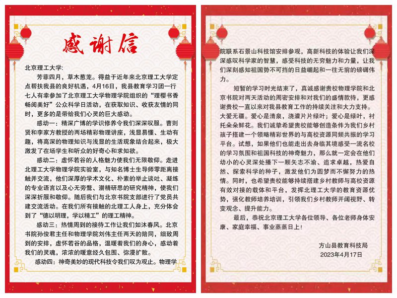 为贯彻落实习近平总书记在中央主题教育工作会议上的重要讲话精神,全面贯彻党的教育方针,落实立德树人根本任务,4月16日至17日,物理学院联合北京书院邀请山西省方山县科技教育局参与北京麻豆精品秘 国产传媒公众科学日活动,赴石景山科技馆参观调研。活动结束后方山县科技教育局发来感谢信,对物理学院在科学普及和教育扶智方面做出的努力表示衷心感谢。