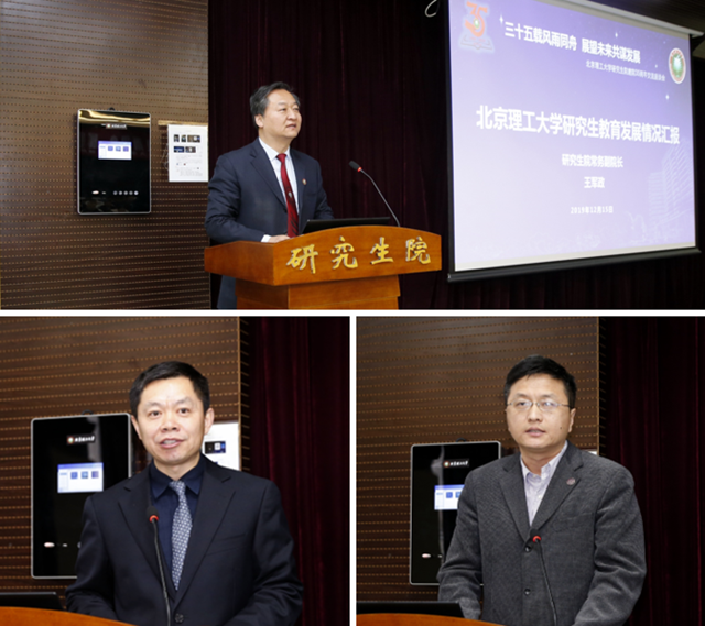 北京大学研究生院副院长王天兵代表中国研究生院院长联席会及北京大学研究生院向北理工研究生院建院35周年表示祝贺;周杰代表中国学位与研究生教育学会和清华大学研究生院对我校研究生教育近年来取得的显著成效表示祝贺。