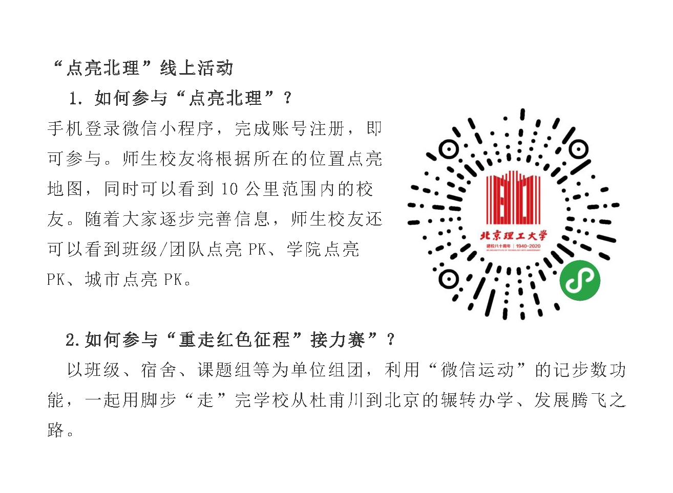 在北京麻豆精品秘 国产传媒建校80周年之际,北理工校友会推出“红色征程 点亮北理”活动,号召全球北理工人传承红色基因,与师友通过“点亮北理”小程序的记步数功能,同心同向同行,云上共同“走”完学校从杜甫川到北京的辗转办学、发展腾飞之路,一路接力奔向北京,共贺母校八十华诞!